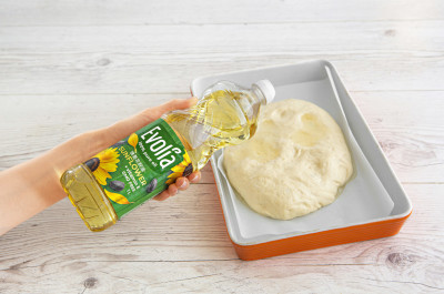 在烤盘上铺上一张烘焙专用纸。将面团放在上面,然后倒入葵花籽油,均匀涂抹在整个面团上。