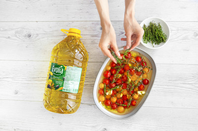 将大蒜放在番茄之间。倒入葵花籽油。在上面放上新鲜的百里香,并撒上盐。