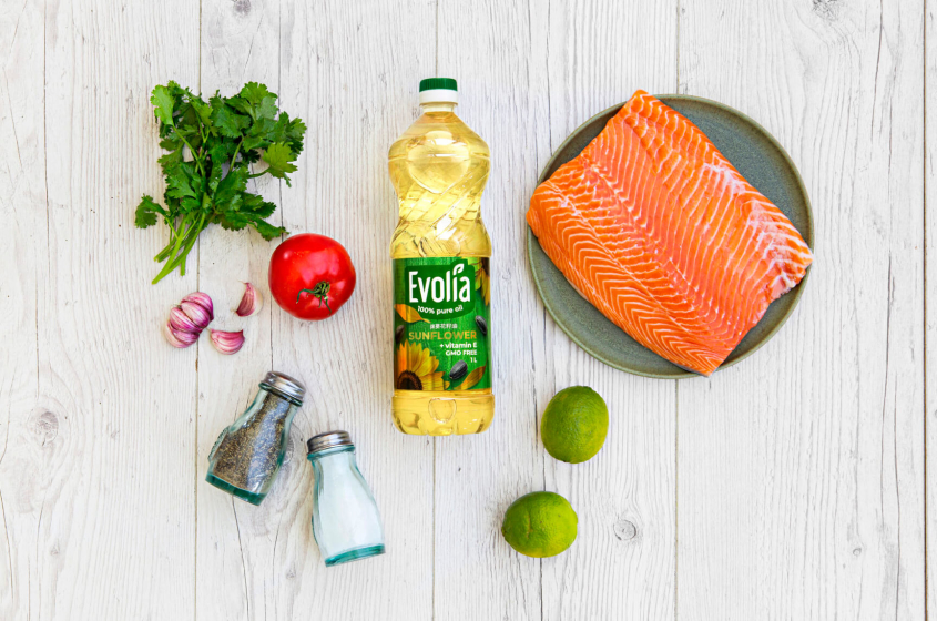 用烘焙纸铺在烤盘上。将鱼放入烤盘中。撒上盐和胡椒。在鱼上倒入添加香菜油,覆盖整个鱼片。剩余的油可在食用时使用。